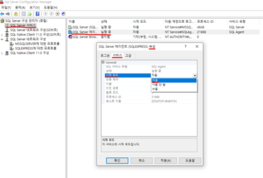 - SQL Server 서비스에서 에이전트 시작 및 시작모드 자동 설정