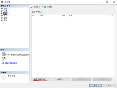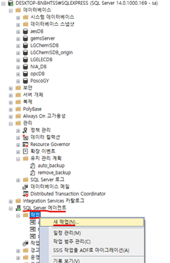 - SSMS(Microsoft SQL Server Management Studio)에서 DB 서버에 로그인 후 에이전트에서 새 작업을 추가한다.