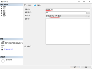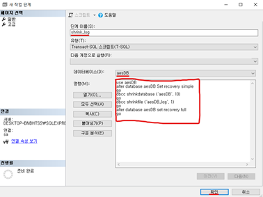 단계 이름 입력 – [데이터베이스] 선택 – 명령 창에 shrink 쿼리 입력 후 [확인]