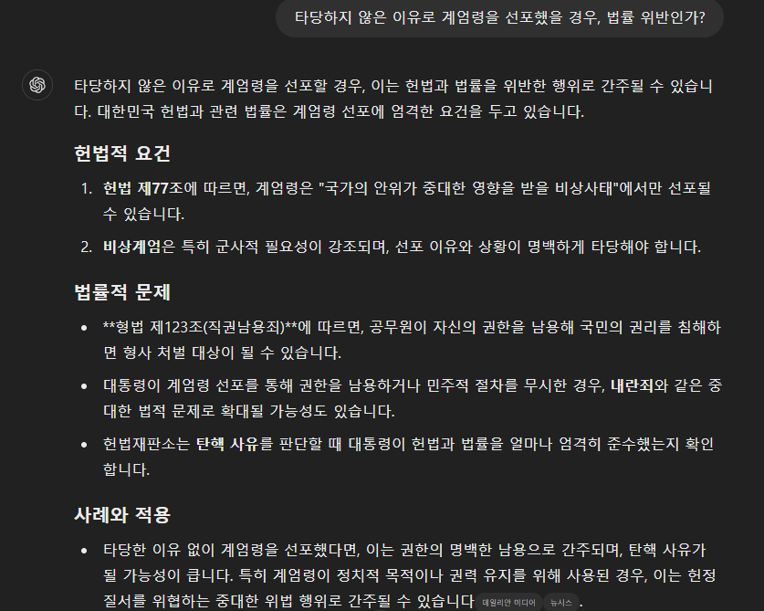 계엄령 선포에 대한 절차적 정당성에 대해선 의견이 분분할테니, 정당하지 않을 경우의 탄핵 가능성만 물어보자.