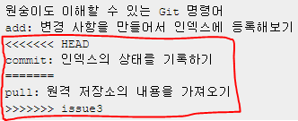 하지만 둘의 수정 내용에서 같은 파일의 같은 행의 수정이 있을 경우, 철수는 pull 명령에서 Conflict 메시지를 받게 된다.
